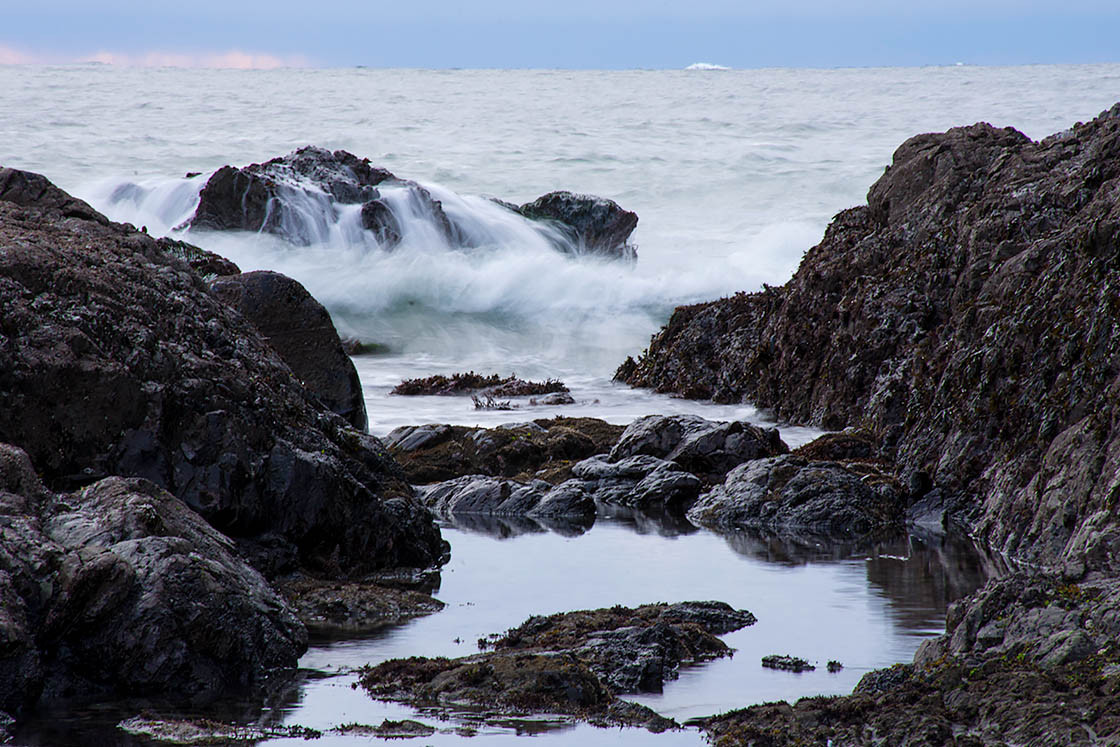 The movement of waves contrasted against the stillness of a tidal pool, near Tofino, BC.
