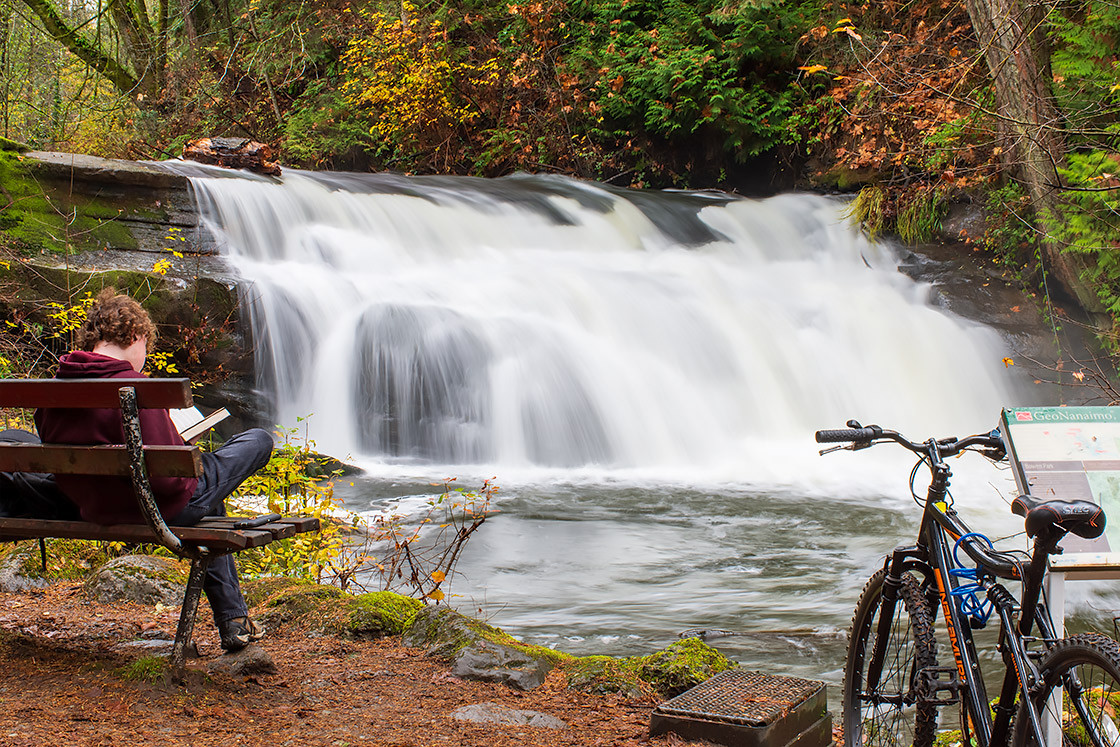 The Millstream River cascading through Bowen Park in Nanaimo, BC, with a youth on a bench reading a book, autumn 2025.