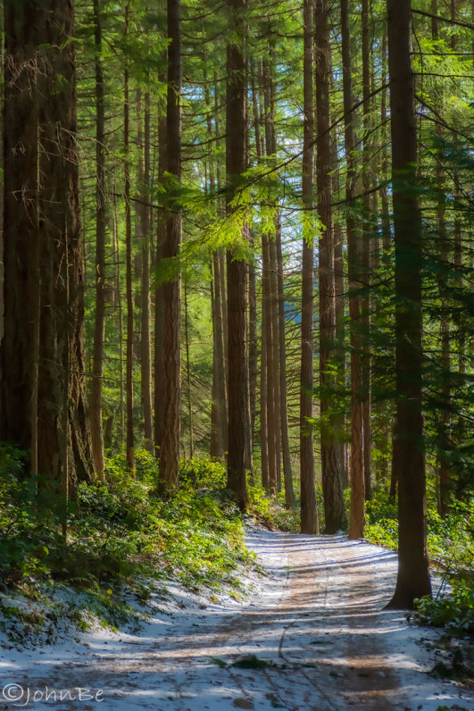 Soft light glows through the branches of the forest along a lightly snow-covered trail. Vancouver Island, BC