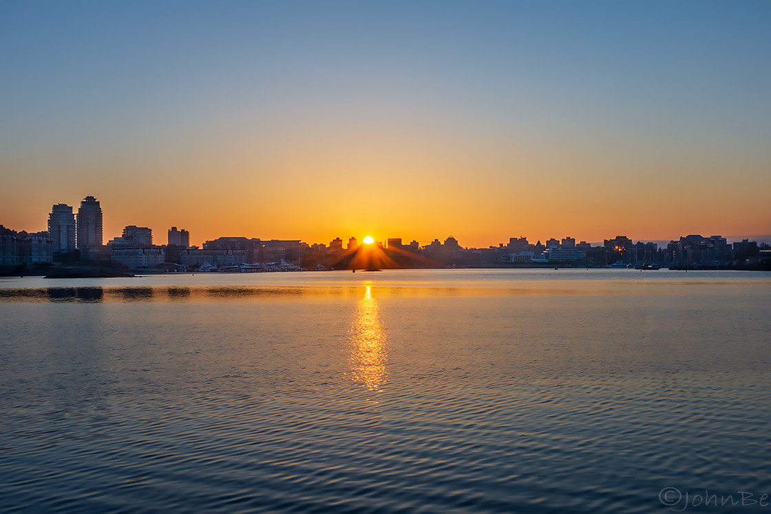The glorious orange ball of fire rises above the Inner Harbour of Victoria, BC - March 2023